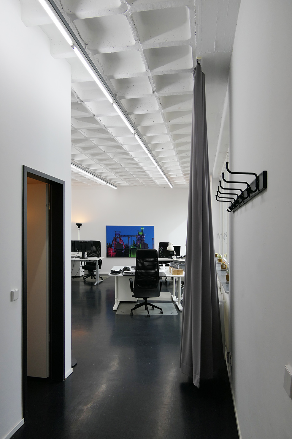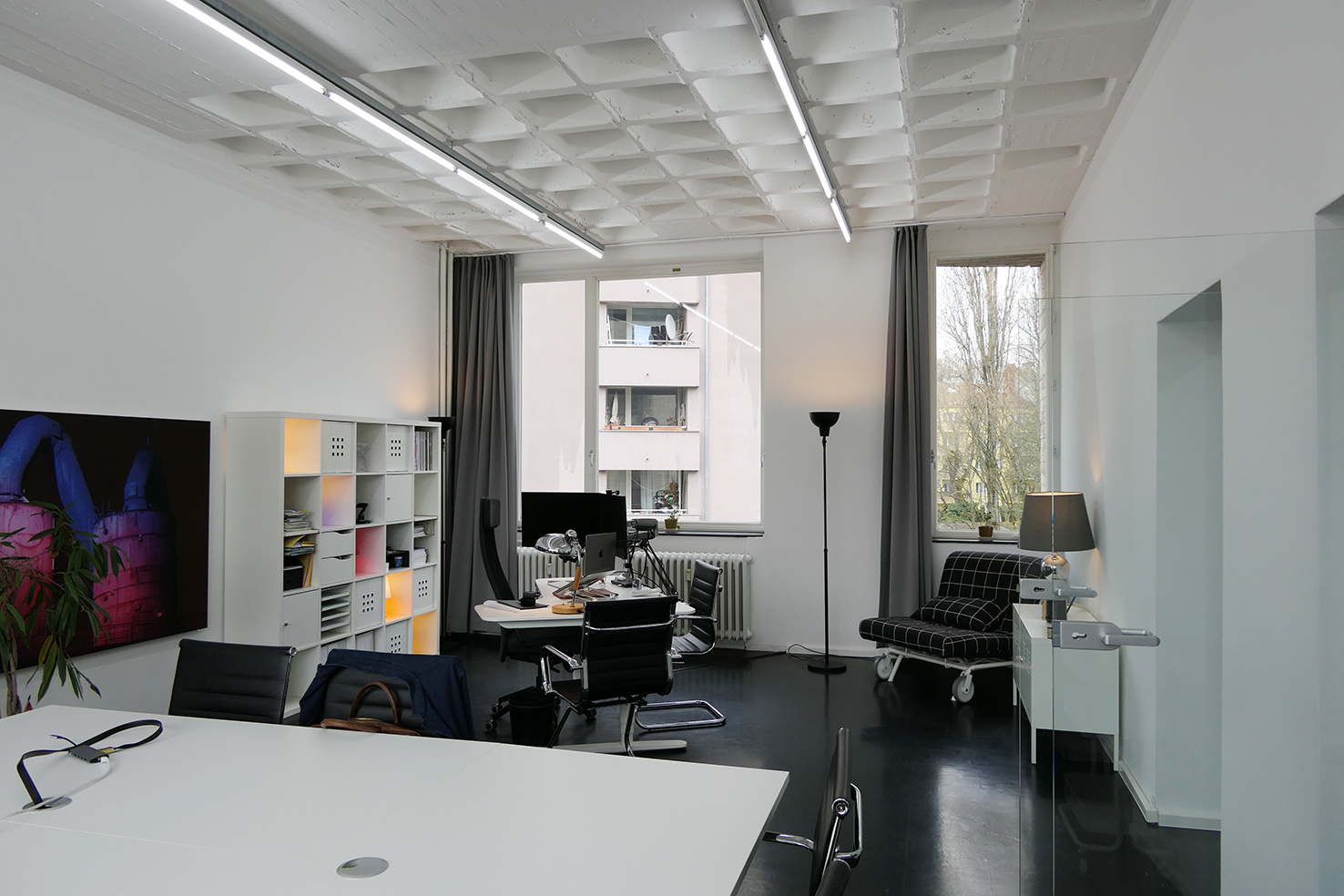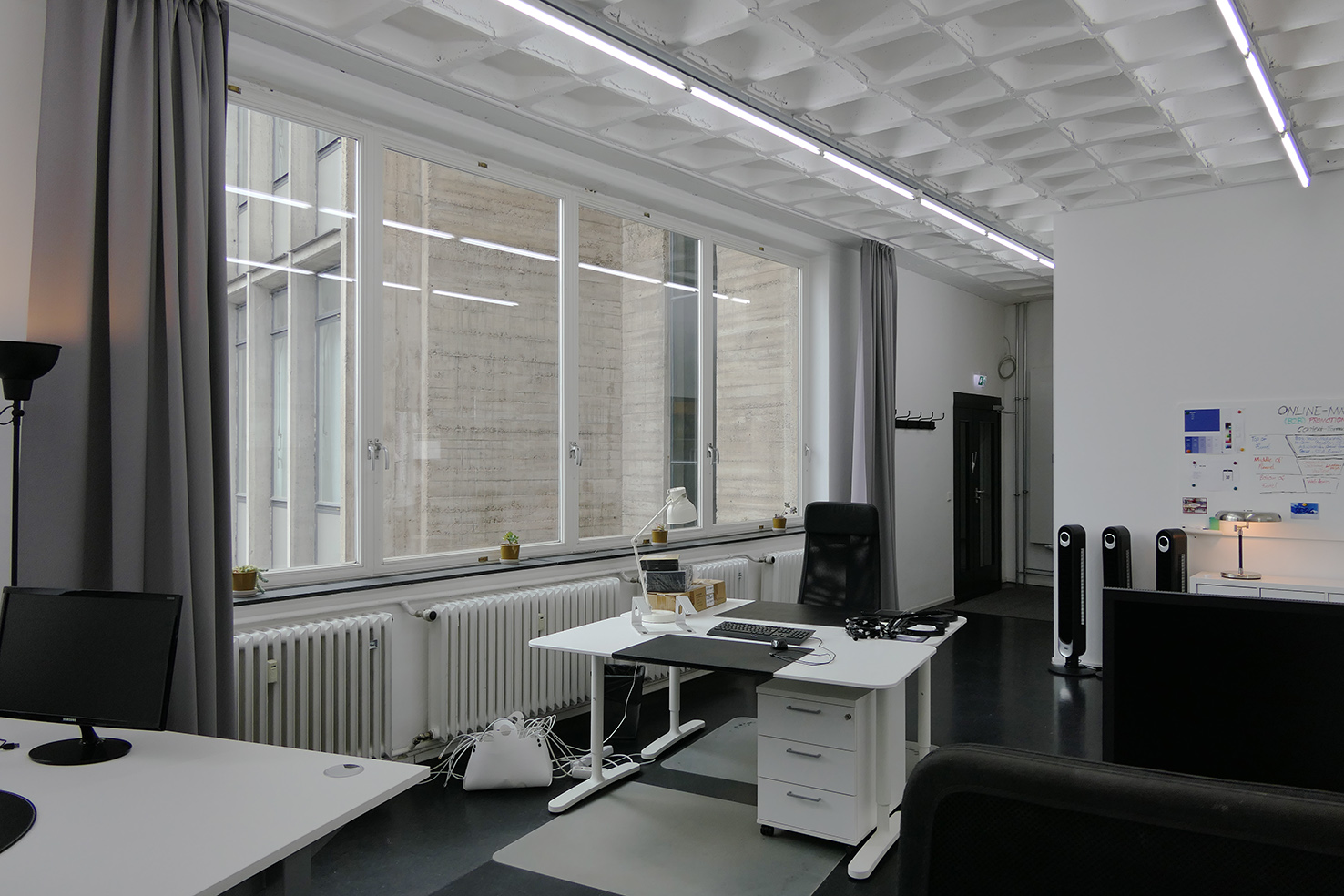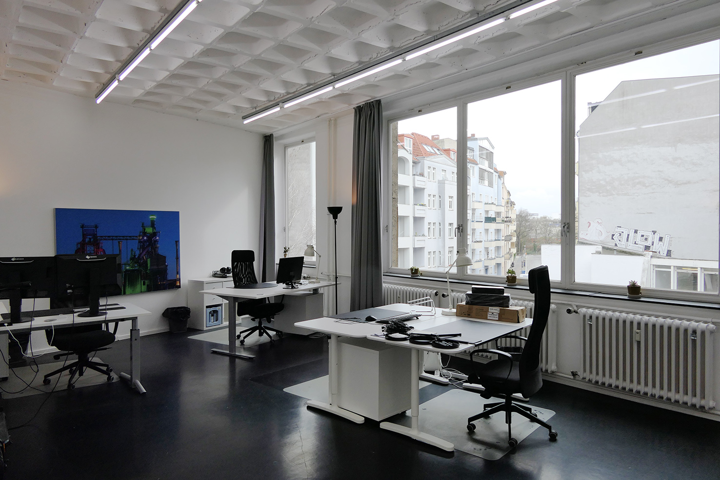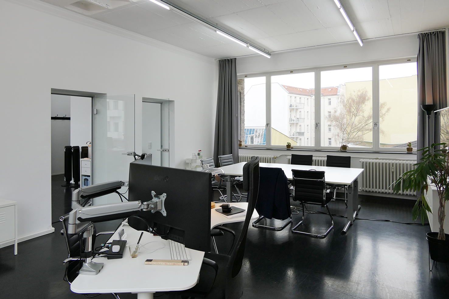 Die Einheit ist 94,3 qm groß, verfügt über zwei großzügige Arbeitsbereiche, ein WC und eine Teeküche. Sie eignet sich zur Nutzung als Büro, für Meetings und nur bedingt für leichte handwerkliche Tätigkeiten. Netzwerkkabel sind in der gesamten Einheit verlegt. Es gibt einen Personenaufzug. Auf dem ExRotaprint Gelände gibt es eine Kantine. Die Bilder zeigen die Möblierung der Vormieter.