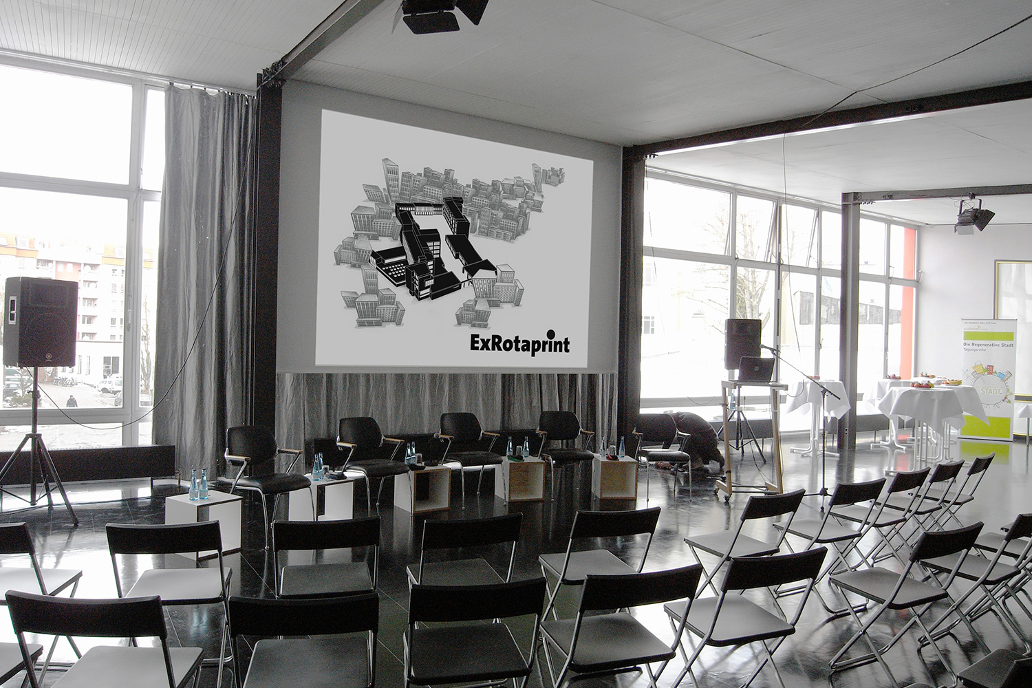 ExRotaprint vermietet tageweise einen schönen, sehr hellen und zentral gelegenen Projektraum für Veranstaltungen. Der wegen seiner Transparenz „Glaskiste“ genannte Raum eignet sich besonders für Workshops, Seminare, Tagungen, Konferenzen, Lesungen, Diskussionen oder Präsentationen für bis zu 100 Besuchern. Feste oder Musikprogramme sind aufgrund der Lautstärke nur in Ausnahmen möglich.